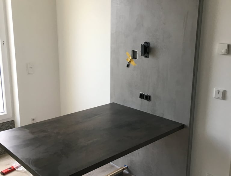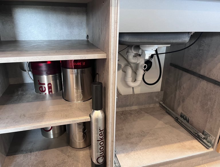 Präziser Küchenaufbau mit Wasser- und Elektroanschluss.